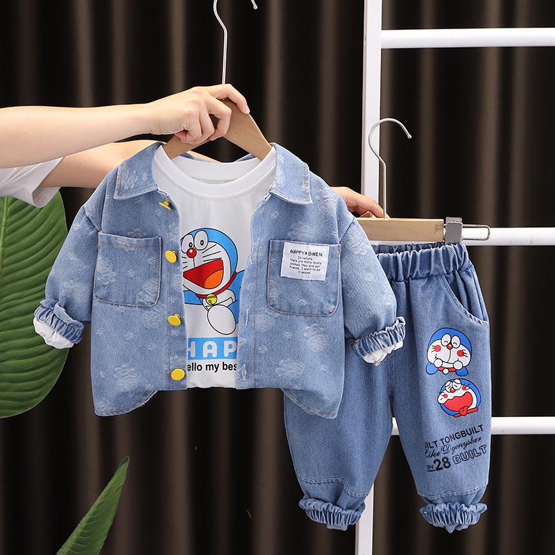 2023 Autumn New Boys and Girls Cartoon Denim Long Sleeve Three Piece Baby Cute Pants Set