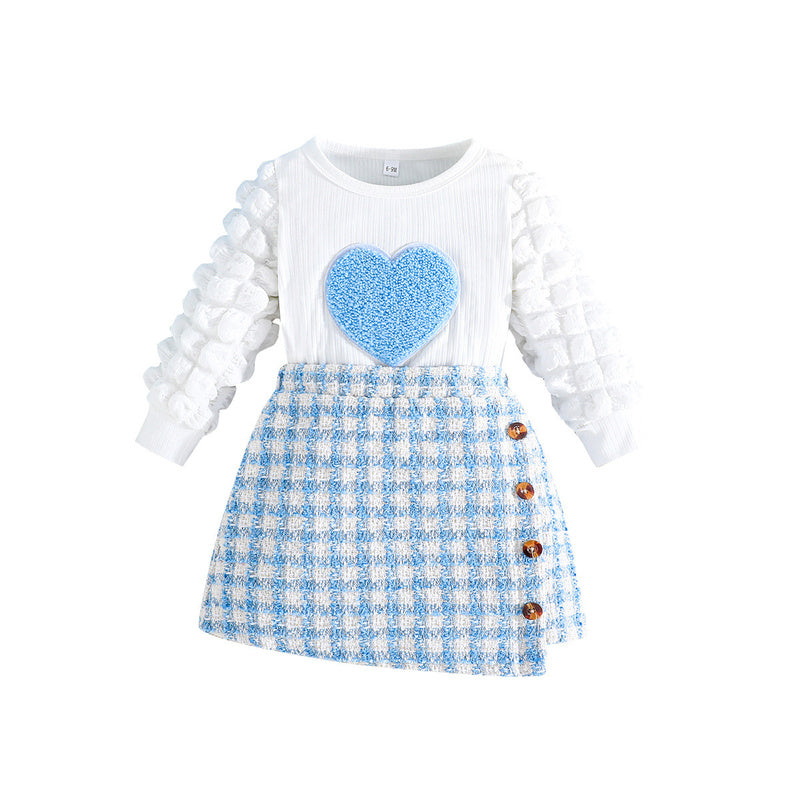 2024 Autumn White Love Embroidered Bubble Sleeve Top Button Sky Blue Checkered Skirt Baby Set