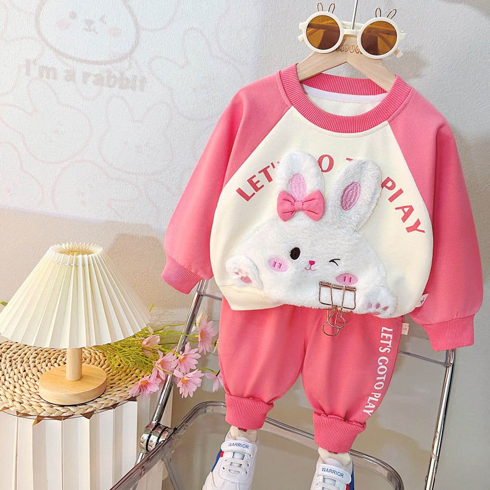 Boys' outfit 2024 new cute girls' spring and autumn plush animal hoodie Korean version baby two-piece set