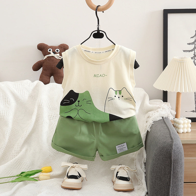 Boys' Sleeveless 2024 New Baby and Children's Summer Dress, Cartoon Tank Top, Stylish Two Piece Set