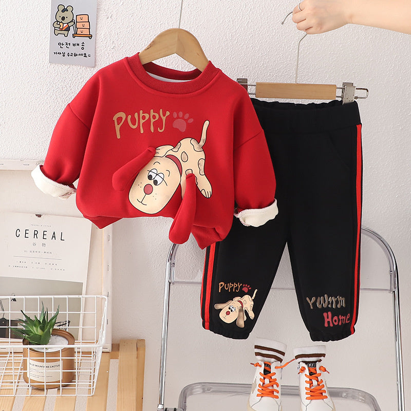 Children's Autumn/Winter 2024 New Handsome Boys' Stylish Hoodie Two Piece Set Baby with Velvet Warmth