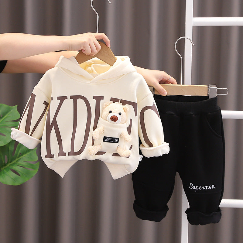 Five Little Seven Children's Clothing 2024 Autumn/Winter New Collection 0-4 Year Old Boys' Letter Bear and Velvet Hoodie 2 Sets