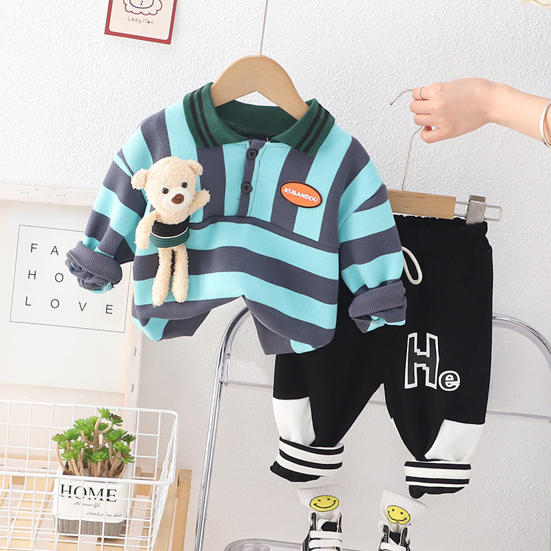 Spring and Autumn New Children's Cartoon Bear Striped Collar Baby Long Sleeve Sports Pants Two Piece Set for Boys